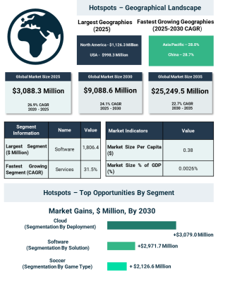 スポーツにおける人工知能市場は、スポーツ団体、リーグ、テクノロジー提供企業が、選手のパフォーマンス向上、安全性改善、よりパーソナライズされたファン体験の提供を目的として人工知能の導入を拡大していることにより、急速に拡大しています。2025年には、世界のスポーツにおける人工知能市場は30億8,830万ドルに達し、2020年以降、年平均成長率26.9%という強い成長を示しました。