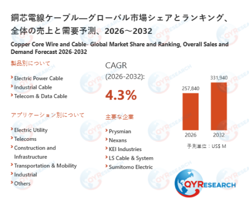 2026年2月5日に、QYResearch株式会社(所在地:東京都中央区)は、「銅芯電線ケーブル―グローバル市場シェアとランキング、全体の売上と需要予測、2026~2032」の最新調査資料を公開しました。本レポートは、銅芯電線ケーブル市場の市場規模、成長動向、競争環境、地域別分析、主要企業のランキングを詳細に分析し、市場の全体像を明確にします。特に、主要企業の市場シェアや競争戦略に焦点を当て、売上高、価格動向、需要予測などの詳細データを通じて、業界の現状と将来の展望を示します。2026年から2032年までの市場成長を詳細に予測し、企業の競争力強化と市場戦略の最適化に役立つ実践的な知見を提供しています。また、定量・定性両面の分析を通じて、戦略的な意思決定を強力にサポートし、業界関係者が市場の変化を正確に把握し、持続可能な成長を実現することを可能にします。