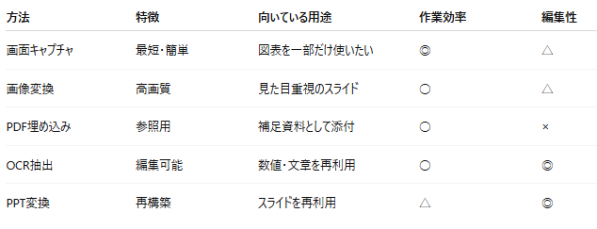特に、PDFの一部だけをスライドに貼り付けたい場合や、短時間で資料を作成したい場合に最適です。