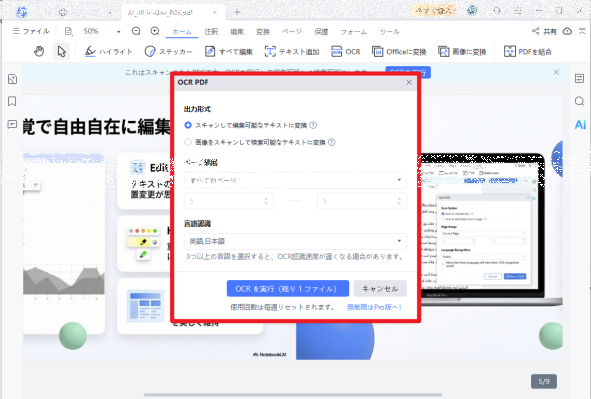 これにより、画像ベースのPDFやスキャンPDFでも文字をテキストとして認識でき、編集可能な状態に変換できます。