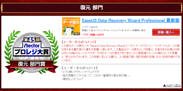 第45回Vectorプロレジ大賞 復元部門賞 | EaseUS Data Recovery Wizard Professional