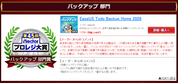 第45回Vectorプロレジ大賞 バックアップ部門賞 | EaseUS Todo Backup Home 2026