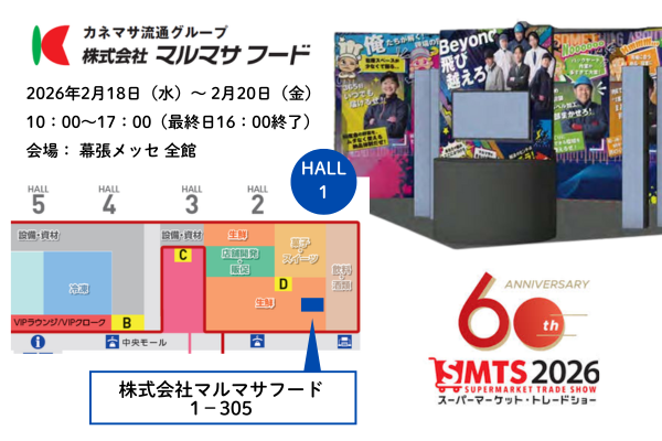 青果卸売業のカネマサ流通グループ 株式会社マルマサフード(本社:大阪市東住吉区、代表取締役社長:金澤向志)は、2026年2月18日(水)より幕張メッセにて開催される「第60回スーパーマーケット・トレードショー2026」に出展いたします。