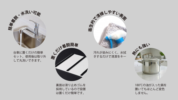 熱を伴う調理器具や食器の仮置き用作業面として