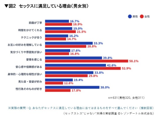 次に、「セックスに満足している」(とても満足している/満足している)と回答した407人(男性216、女性191)を対象に、その理由を男女別に見ていきます。