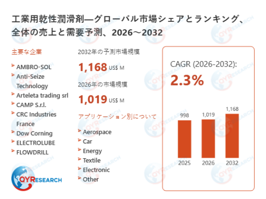 2026年2月9日、QYResearch株式会社(所在地:東京都中央区)は、「工業用乾性潤滑剤―グローバル市場シェアとランキング、全体の売上と需要予測、2026~2032」に関する最新の市場調査レポートを発表しました。本レポートは、工業用乾性潤滑剤の世界市場における売上規模、販売数量、価格動向、市場シェア、主要企業のポジショニングなどを網羅的に分析したものです。地域別・国別の市場構造に加え、製品タイプ別および用途別のセグメントに基づく詳細なデータを提供しています。