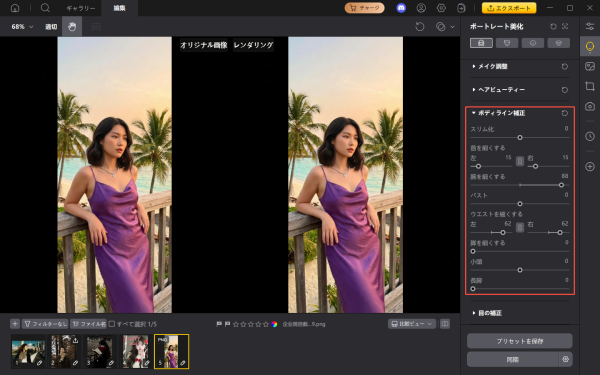 筋肉感の調整や全身バランスの微修正にも対応しており、短時間で仕上げたい自撮り写真との相性が良い点も特徴です。無料版でも主要な補正機能を問題なく使用できます。