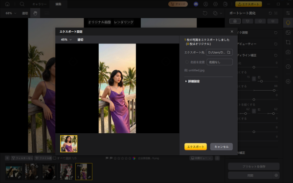 手順3:仕上げた写真を「エクスポート」で保存し、出力先と画質を選ぶだけで完了です。