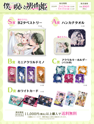 ファンの要望を受けて、「僕の呪いの吸血姫」の「カワセルくじ」の【復刻再販】が開始です。「カワセルくじ」限定の金井千咲貴先生の描き下ろしイラストはS賞B2タペストリーとA賞ハンカチタオルに使用!