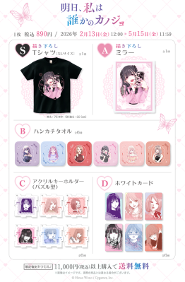 S賞:Tシャツ、A賞:ミラーは「ゆあ」のミラーセルフィーを描いた「カワセルくじ」だけの限定描き下ろしイラストを使用!その他にも、「明日、私は誰かのカノジョ」の世界観を存分にお楽しみいただるグッズが盛り沢山の魅力的な賞品ラインナップとなっております。