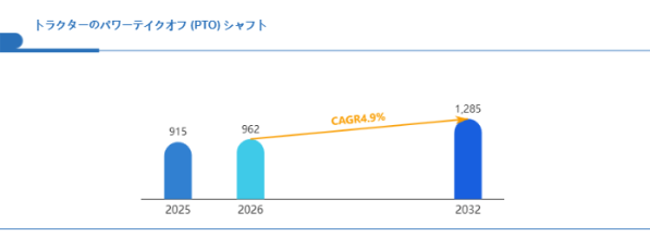 Global Reports調査チームの最新レポート「グローバルトラクターのパワーテイクオフ (PTO) シャフト市場規模、主要企業シェア、ランキング分析レポート【2026年版】」によると、2026年の962百万米ドルから2032年には1285百万米ドルに成長し、2026年から2032年の間にCAGRは4.9%になると予測されています。