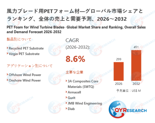 2026年2月11日、QYResearch株式会社(所在地:東京都中央区)は、「風力ブレード用PETフォーム材―グローバル市場シェアとランキング、全体の売上と需要予測、2026~2032」に関する最新の調査レポートを発表しました。本レポートは、風力ブレード用PETフォーム材市場における全体の市場規模、販売動向、価格推移、地域別・国別の成長傾向、製品タイプや用途ごとのセグメント分析を網羅しています。