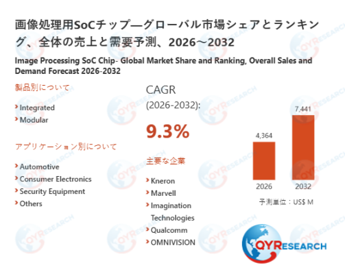 2026年2月11日、QYResearch株式会社(所在地:東京都中央区)は、「画像処理用SoCチップ―グローバル市場シェアとランキング、全体の売上と需要予測、2026~2032」に関する最新の市場調査レポートを発表しました。本レポートは、画像処理用SoCチップの世界市場における売上規模、販売数量、価格動向、市場シェア、主要企業のポジショニングなどを網羅的に分析したものです。地域別・国別の市場構造に加え、製品タイプ別および用途別のセグメントに基づく詳細なデータを提供しています。