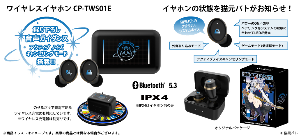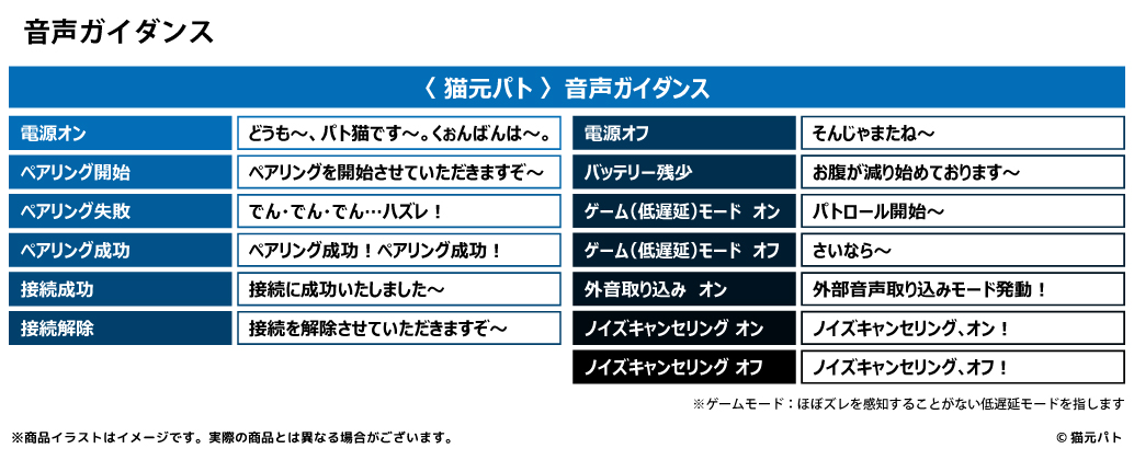 本コラボレーションモデルは、左右のイヤホンや充電ケースにマークやアイコンをあしらい、黒を基調とした高級感のある商品となっております。また内蔵されているボイスは完全録り下ろし(全13ワード)です。パッケージには、本コラボレーションモデルのために撮り下ろされた『猫元パト』のビジュアルを採用しています。