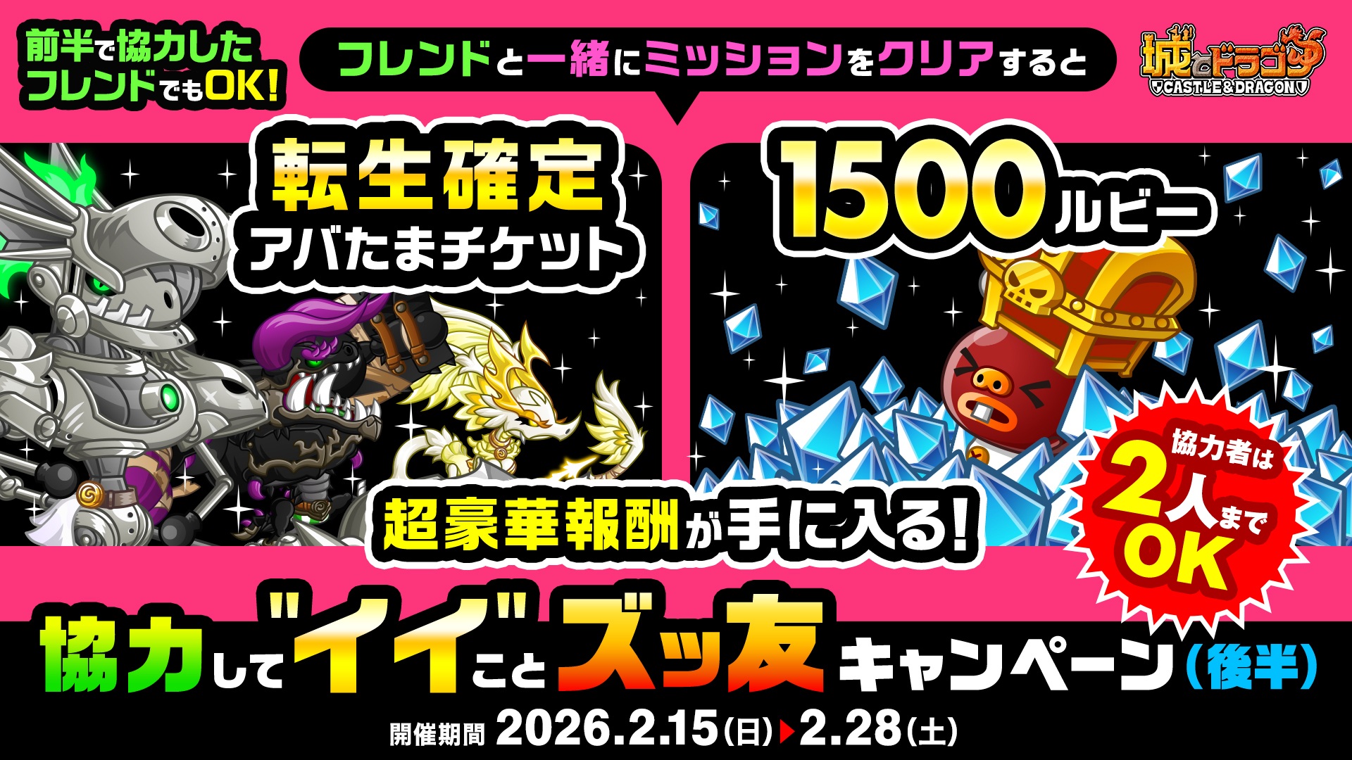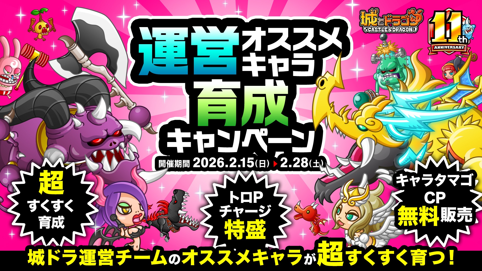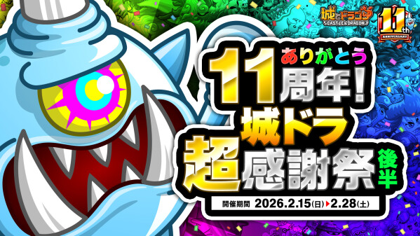 株式会社アソビズム(本社:東京都千代田区、代表取締役:大手智之)は、App Store・Google Playにて好評配信中の『城とドラゴン』で、「ありがとう11周年!城ドラ超感謝祭(後半)」を2026年2月15日(日)0:00より開催中です。