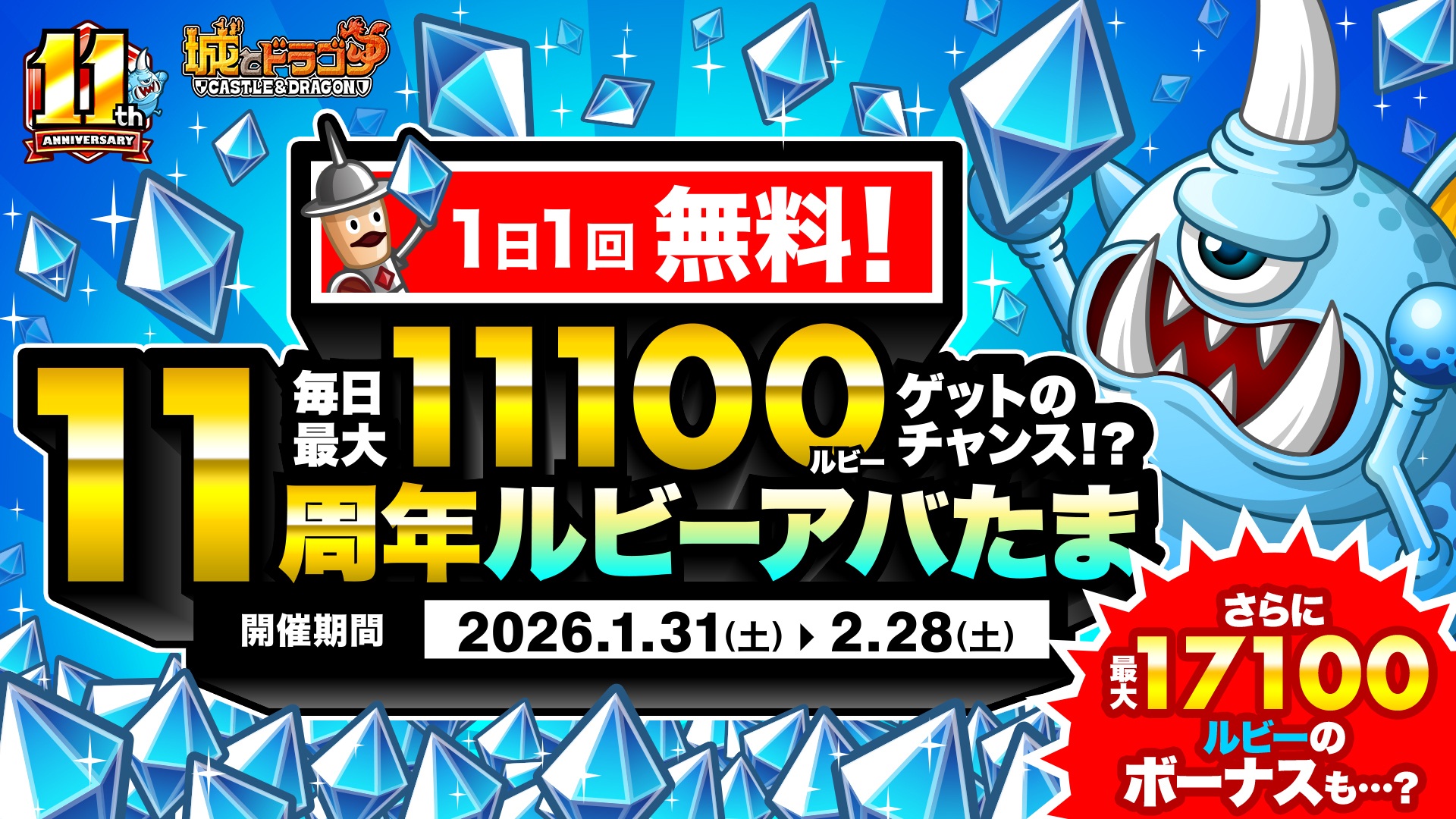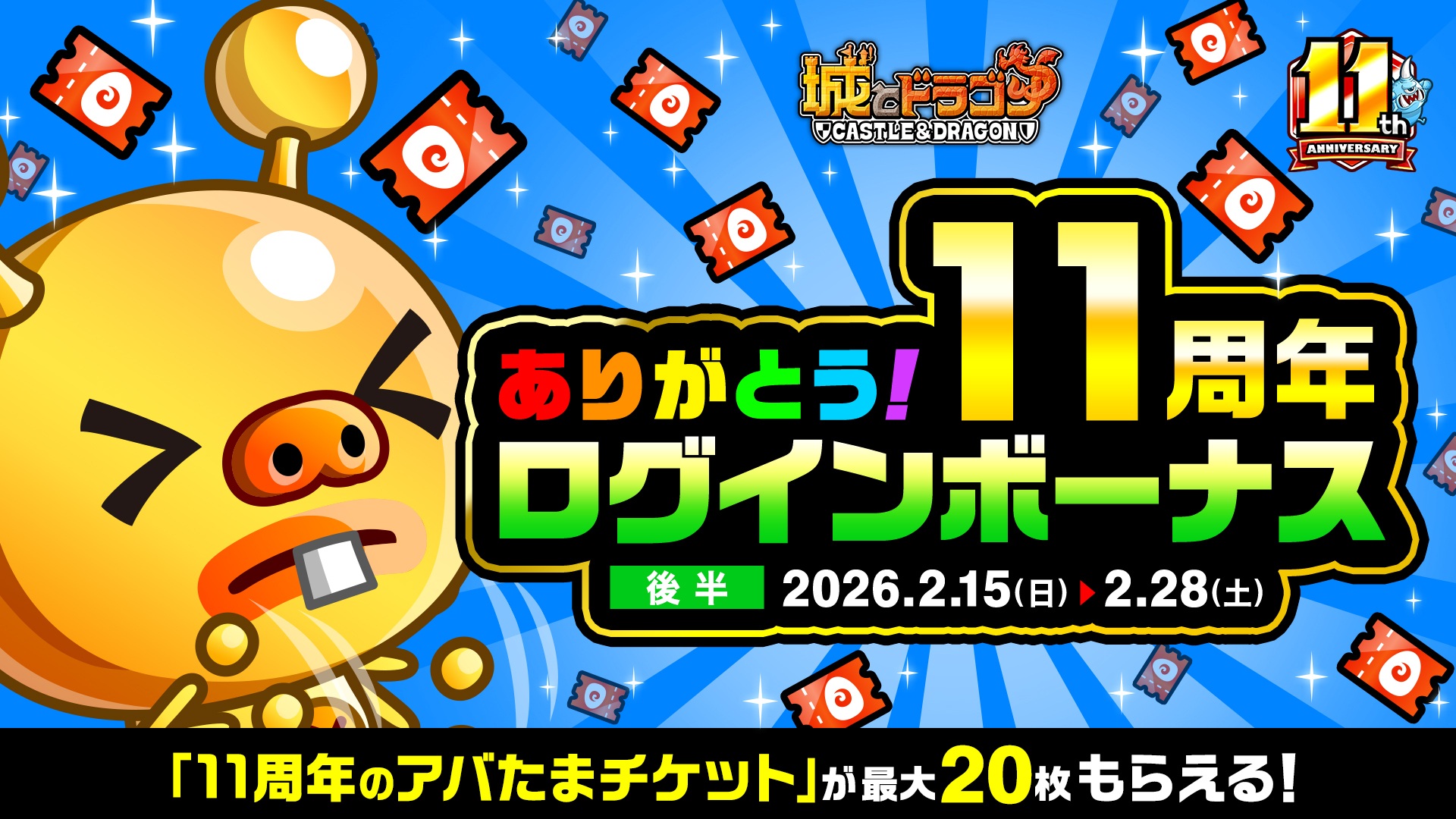 現在開催中の『城とドラゴン』11周年記念キャンペーン「ありがとう11周年!城ドラ超感謝祭(後半)」を、2月15日(日)0時より開催中です。特別なログインボーナスやミッションはもちろん、1日1回最大“11,100ルビー”が当たる!?「11周年ルビーアバたま」、最高“101,100ルビー”などが当たる「城ドラ宝くじ」、さらに「運営オススメキャラ育成キャンペーン」など内容盛りだくさん。後半も『城とドラゴン』のお祭りをぜひお楽しみください!
