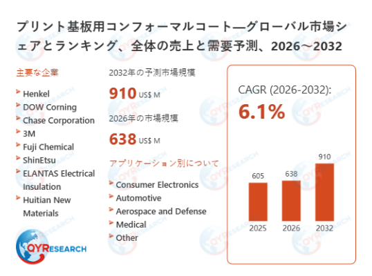 2026年2月13日に、QYResearch株式会社(所在地:東京都中央区)は、「プリント基板用コンフォーマルコート―グローバル市場シェアとランキング、全体の売上と需要予測、2026~2032」の最新調査資料を公開しました。本レポートは、プリント基板用コンフォーマルコート市場の市場規模、成長動向、競争環境、地域別分析、主要企業のランキングを詳細に分析し、市場の全体像を明確にします。特に、主要企業の市場シェアや競争戦略に焦点を当て、売上高、価格動向、需要予測などの詳細データを通じて、業界の現状と将来の展望を示します。2026年から2032年までの市場成長を詳細に予測し、企業の競争力強化と市場戦略の最適化に役立つ実践的な知見を提供しています。また、定量・定性両面の分析を通じて、戦略的な意思決定を強力にサポートし、業界関係者が市場の変化を正確に把握し、持続可能な成長を実現することを可能にします。