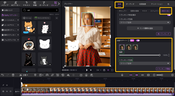 ② 動画クリップを選択し、右側設定パネルの「動画>AIツール」から「自動モザイク」を選択します。