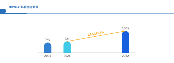 Global reports調査チームの最新レポート「グローバル手のひら静脈認識装置市場規模、主要企業シェア、ランキング分析レポート【2026年版】」によると、グローバル手のひら静脈認識装置市場は2025年の740百万米ドルから2032年には1565百万米ドルに成長し、2026年の市場規模は約821百万米ドルと推計されており、2026-2032年のCAGR(年間成長率)が11.4%に達すると予測されている。