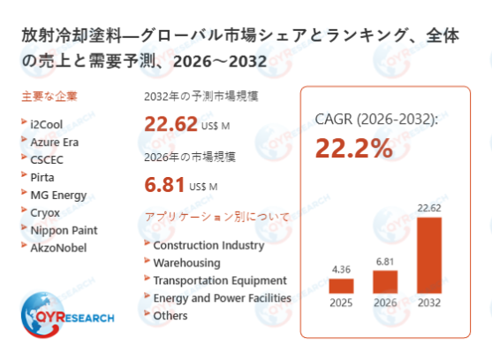 2025年における放射冷却塗料の世界市場規模は、4.36百万米ドルと予測され、2026年から2032年の予測期間において、年間平均成長率(CAGR)22.2%で成長し、2032年までに22.62百万米ドルに達すると予測されている。