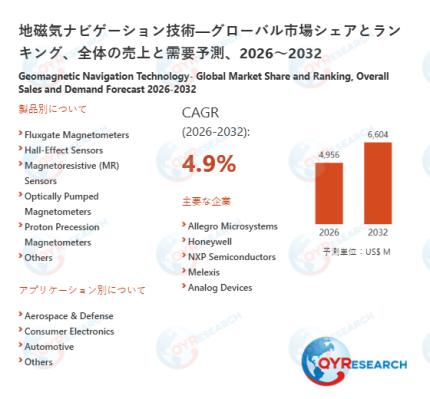 2026年2月14日に、QYResearch株式会社は「地磁気ナビゲーション技術―グローバル市場シェアとランキング、全体の売上と需要予測、2026~2032」の調査レポートを発表しました。本報告書は、地磁気ナビゲーション技術の世界市場に関する売上、販売量、価格、市場シェア、主要企業のランキングなどを網羅し、地域別、国別、製品タイプ別、用途別に詳細に分析しています。また、地磁気ナビゲーション技術の市場規模を、2021年から2032年までの市場パターンに基づき、将来の市場動向を予測しています。本調査は、定量的データとともに、企業が成長戦略を策定し、競争環境を評価し、市場ポジションを分析するための定性的分析も提供しています。