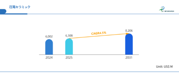 LP Information調査チームの最新レポートである「世界圧電セラミック市場の成長予測2026~2032」(https://www.lpinformation.jp/reports/579170/piezoelectric-ceramics)によると、2025年から2031年の予測期間中のCAGRが4.5%で、2031年までにグローバル圧電セラミック市場規模は82.06億米ドルに達すると予測されている。