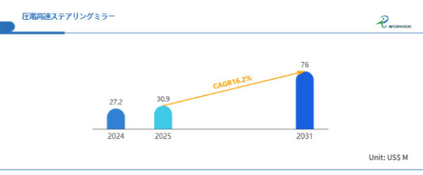 LP Information調査チームの最新レポートである「世界圧電高速ステアリングミラー市場の成長予測2026~2032」(https://www.lpinformation.jp/reports/593853/piezoelectric-fast-steering-mirror)によると、2025年から2031年の予測期間中のCAGRが16.2%で、2031年までにグローバル圧電高速ステアリングミラー市場規模は0.76億米ドルに達すると予測されている。
