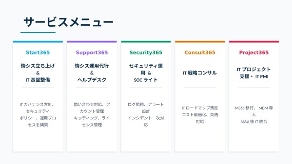 事業内容:中小企業向けIT運用支援・情シスアウトソーシング、Microsoft 365 導入・運用支援、ITセキュリティコンサルティング、ITプロジェクトマネジメント
