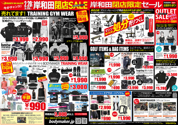 行っているBODYMAKER株式会社(本社:大阪府吹田市垂水町3-16-17 代表:長淵 翔)よりお知らせです。感謝感激!ご愛顧いただきましたボディメーカー岸和田カンカンベイサイドモール店は、施設契約満了にともない閉店の運びとなりました。(3月29日(日)完全閉店)ボディメーカー岸和田カンカンベイサイドモール店では、日頃のご愛顧に対する感謝の気持ちを込めて、2月20日(金)より「岸和田閉店SALE」をスタートします。