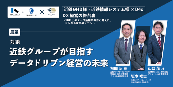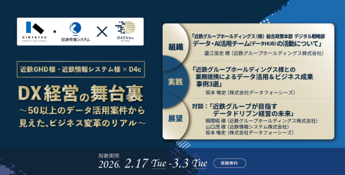 データサイエンスを活用したビジネス変革を支援するデータフォーシーズ株式会社(本社:東京都港区、代表取締役社長:古本 孝)は、近鉄グループホールディングス株式会社様(本社:大阪府大阪市天王寺区、代表取締役社長:若井 敬)と近鉄情報システム株式会社様(本社:大阪府大阪市天王寺区、代表取締役社長:藤井 秀夫)とウェビナー「【近鉄GHD様・近鉄情報システム様 × D4c】DX経営の舞台裏~50以上のデータ活用案件から見えた、ビジネス変革のリアル~」を2026年2月17日(火)~2026年3月3日(火)に配信いたします。