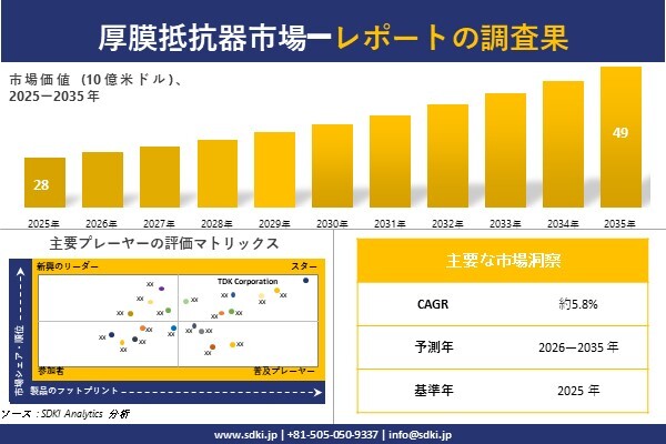 SDKI Analytics(本社:東京都渋谷区)は、このたび、2026年02月16に「厚膜抵抗器市場調査レポート:2026-2035年の市場規模、シェア、傾向の予測」を発表しました。厚膜抵抗器に関する市場調査レポートには、統計的および分析的アプローチを使用した予測評価が含まれています。この調査レポートでは、一次および二次調査方法を使用して分析された主要な業界洞察を通じて将来の傾向を理解できるようにすることで、主要な市場動向を読者に説明しています。