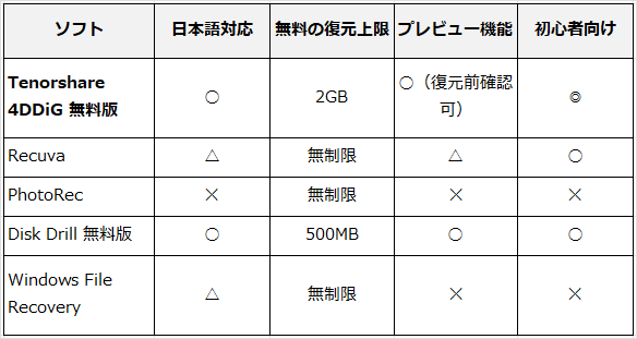 Recuvaは無制限ですがフォーマット後のスキャン精度は限定的。PhotoRecは高性能ですがコマンドライン操作が必要です。Disk Drillの500MB制限は現代のRAWファイルでは数枚で埋まります。