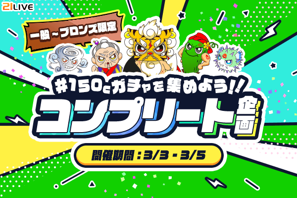 21LIVEでは、3月3日(火)から3月5日(木)までの期間、『150Cガチャを集めよう!!コンプリート企画』を開催します。