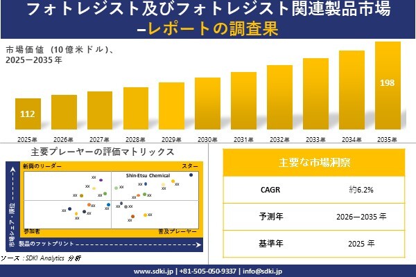 SDKI Analytics(本社:東京都渋谷区)は、このたび、2026年02月19に「フォトレジスト及びフォトレジスト関連製品市場調査レポート:2026-2035年の市場規模、シェア、傾向の予測」を発表しました。フォトレジスト及びフォトレジスト関連製品に関する市場調査レポートには、統計的および分析的アプローチを使用した予測評価が含まれています。この調査レポートでは、一次および二次調査方法を使用して分析された主要な業界洞察を通じて将来の傾向を理解できるようにすることで、主要な市場動向を読者に説明しています。