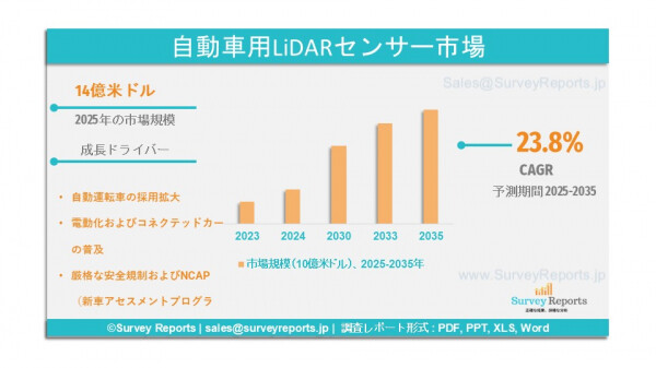 Survey Reports LLCは、2026年02月に『自動車用LiDARセンサー市場:タイプ別(飛行時間法(ToF)および周波数変調連続波(FMCW))、技術別(ソリッドステートおよび電気機械式)、用途別(準自律走行車および自律走行車)―世界市場分析、動向、機会および予測(2025年~2035年)』という調査報告書を発表したと公表した。本報告書は、自動車用LiDARセンサー市場の将来予測評価を提供している。さらに、市場の成長要因、市場機会、課題、および脅威など、複数の主要な市場ダイナミクスを明らかにしている。