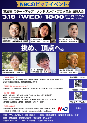 一般社団法人東京ニュービジネス協議会(本部:東京都港区、以下NBC)は、2026年3月18日(水)18時より、NBC主催ピッチイベント「第23回 スタートアップ・メンタリング・プログラム(SMP)決勝大会」 をオルクドール・サロンTOKYO(日本橋)にて開催いたします。