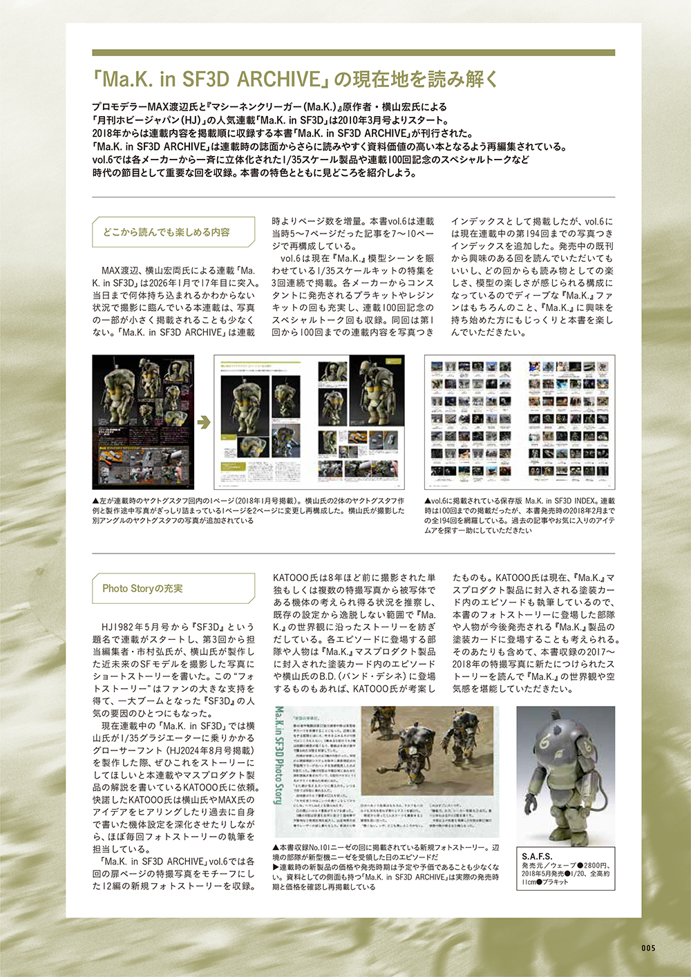 人気連載『Ma.K. in SF3D』を、当時の誌面を基に再編集してたどる「Ma.K. in SF3D ARCHIVE」シリーズの最新刊。現在注目度の高い1/35スケールの特集から始まり、ラプーンやS.A.F.S.などのプラキット、シュトゥルムケーファーなどのレジンキット特集に加え、『Ma.K. in SF3D』連載100回を記念したスペシャルトークで紹介された第1回から第100回までの全アイテムを掲載。