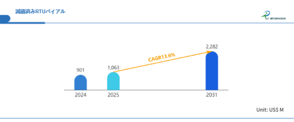 グローバル市場において、滅菌済みRTUバイアルの需要は今後ますます拡大する見通しである。LP Informationの最新調査レポート「世界滅菌済みRTUバイアル市場の成長予測2026~2032」(https://www.lpinformation.jp/reports/594123/pre-sterilized-ready-to-use-vials)によれば、2025年から2031年にかけての年平均成長率(CAGR)は13.6%と予測されており、2031年には市場規模が22.82億米ドルに達すると見込まれている。この成長を支えているのは、世界的な製薬・バイオ産業の活性化と、医薬品の小ロット多品種化というトレンドである。新興感染症対策用ワクチンの量産化や、がん免疫療法、希少疾患向けの高付加価値バイオ医薬品の開発が進む中で、製造スピードと柔軟性を兼ね備えたRTUバイアルは不可欠な存在となっている。さらに、注射剤のグローバル需要増加により、無菌包装ソリューションの高度化は喫緊の課題であり、RTU製品の採用が業界全体に広がりつつある。