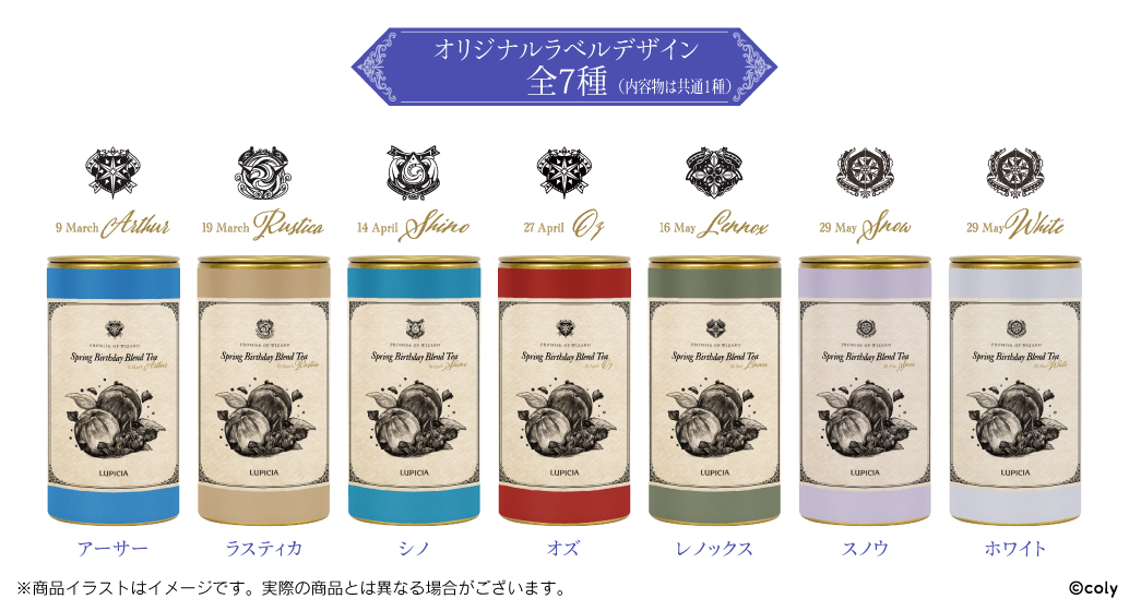 本商品は、3月~5月に誕生日を迎える「アーサー(3月9日)」「ラスティカ(3月19日)」「シノ(4月14日)」「オズ(4月27日)」「レノックス(5月16日)」「スノウ(5月29日)」「ホワイト(5月29日)」の全7種類のオリジナルラベル展開となっておりLUPICIA缶に20g入れ(2.5g×8包)となっております。※内容物は共通1種となります。