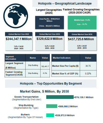 造船および船舶修理市場は2025年に2,443億4,710万ドルに達し、2020年以降年平均7.8%で拡大した。貨物船、海洋関連船舶、海軍艦艇への継続的需要により、2030年には3,296億2,290万ドルに拡大し、期間中年平均6.2%で成長すると見込まれている。長期的には、2035年までに4,377億2,560万ドルへ到達し、2029年以降は年平均5.8%で推移する見通しである。この安定した成長は、世界の供給網における海洋インフラの不可欠性を示している。
