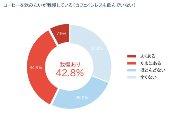 「本当はコーヒーを飲みたいが、カフェインレスコーヒーも飲まずに控えている」ことが「よくある」(7.9%)、「たまにある」(34.9%)と回答した方は合計42.8%にのぼり、コーヒーを我慢している実態が浮き彫りになりました。