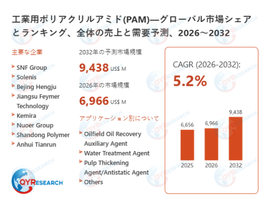 QY Research株式会社は「工業用ポリアクリルアミド(PAM)―グローバル市場シェアとランキング、全体の売上と需要予測、2026~2032」の調査レポートを発表しました。本レポートでは、工業用ポリアクリルアミド(PAM)の世界市場における売上高、販売数量、価格動向、市場シェア、主要企業ランキングを包括的に整理しています。
