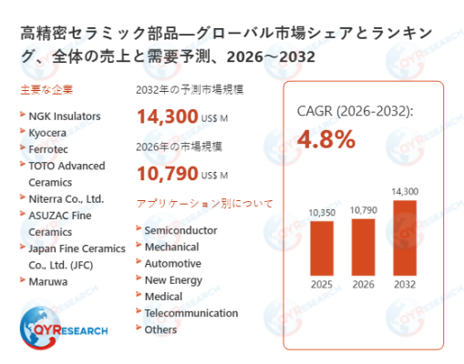 QY Research株式会社(東京都中央区)は、「高精密セラミック部品―グローバル市場シェアとランキング、全体の売上と需要予測、2026~2032」の最新レポートを発表しました。