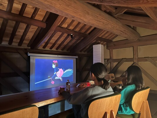 『迎賓蔵ダイニング』でのフルコースとお酒を楽しんだ後は、そのまま蔵の空間が「お酒と映像を楽しむプライベートBar」へと変化します。Google TV搭載のプロジェクターで、お好きな映画や映像を大画面で投影。分厚い土壁の蔵だからこそ叶う大音量の没入感は、既存のお客様からも「帰りたくなくなる」と絶大な支持を集めています。