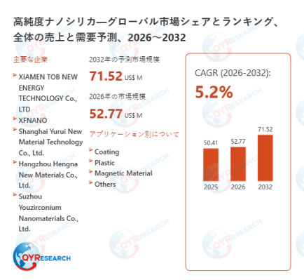 QY Research株式会社(所在地:東京都中央区)は、「高純度ナノシリカ―グローバル市場シェアとランキング、全体の売上と需要予測、2026~2032」に関する最新調査レポートを公開しました。本レポートでは、高純度ナノシリカの世界市場を対象に、市場規模、販売数量、価格推移、市場シェア、主要企業の競争ポジションを体系的に整理し、地域別・国別の動向に加えて、製品タイプ別および用途別の詳細セグメント分析を掲載しています。さらに、2021年から2032年までのデータを基に市場の中長期的な成長軌道を検証し、将来的な拡大余地や投資機会を提示するとともに、競争環境の構造変化や企業戦略の方向性、業界が直面する課題についても多面的に考察しています。