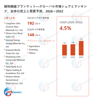 QY Research株式会社は「植物繊維ブランケット―グローバル市場シェアとランキング、全体の売上と需要予測、2026~2032」の調査レポートを発表しました。本レポートでは、植物繊維ブランケットの世界市場における売上高、販売数量、価格動向、市場シェア、主要企業ランキングを包括的に整理しています。
