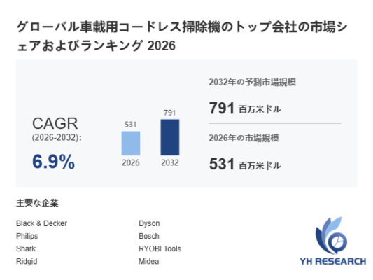 YHResearch調査チームの最新レポート「グローバル車載用コードレス掃除機のトップ会社の市場シェアおよびランキング 2026」によると、2026年の531百万米ドルから2032年には791百万米ドルに成長し、2026年から2032年の間にCAGRは6.9%になると予測されています。