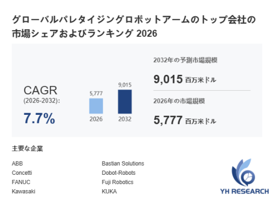 YHResearch調査チームの最新レポート「グローバルパレタイジングロボットアームのトップ会社の市場シェアおよびランキング 2026」によると、2026年の5777百万米ドルから2032年には9015百万米ドルに成長し、2026年から2032年の間にCAGRは7.7%になると予測されています。