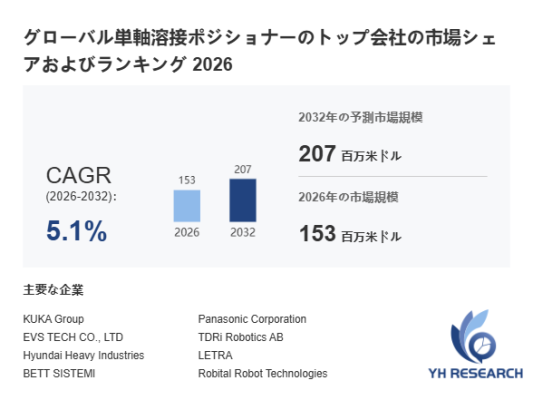 YHResearch調査チームの最新レポート「グローバル単軸溶接ポジショナーのトップ会社の市場シェアおよびランキング 2026」によると、2026年の153百万米ドルから2032年には207百万米ドルに成長し、2026年から2032年の間にCAGRは5.1%になると予測されています。