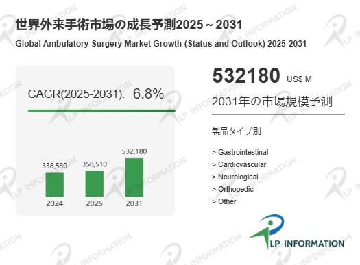 LP Information調査チームの最新レポートである「世界外来手術市場の成長予測2025~2031」(https://www.lpinformation.jp/reports/374717/ambulatory-surgery)によると、同市場は2026年から2032年の予測期間にCAGRが6.8%で推移し、2032年までに市場規模が5321.8億米ドルに達すると予測されている。ここで注目すべきは、外来手術が単なる医療サービス需要の増減ではなく、制度設計と現場運用の整合が取れた領域から順に立ち上がる市場である点である。すなわち、支払い制度・適用範囲・施設要件の枠組みが明確になるほど、病院、外来手術センター、周辺サービスの投資判断が加速しやすい。予測期間の長さは、設備投資・人材配置・紹介ネットワークの再編が時間を要することを示唆する一方、オペレーションの再設計が完了したプレイヤーほど、同一インフラでより多様な症例を吸収できる強みを得る。市場は「量」よりも「移し替えの設計力」で伸びる局面である。
